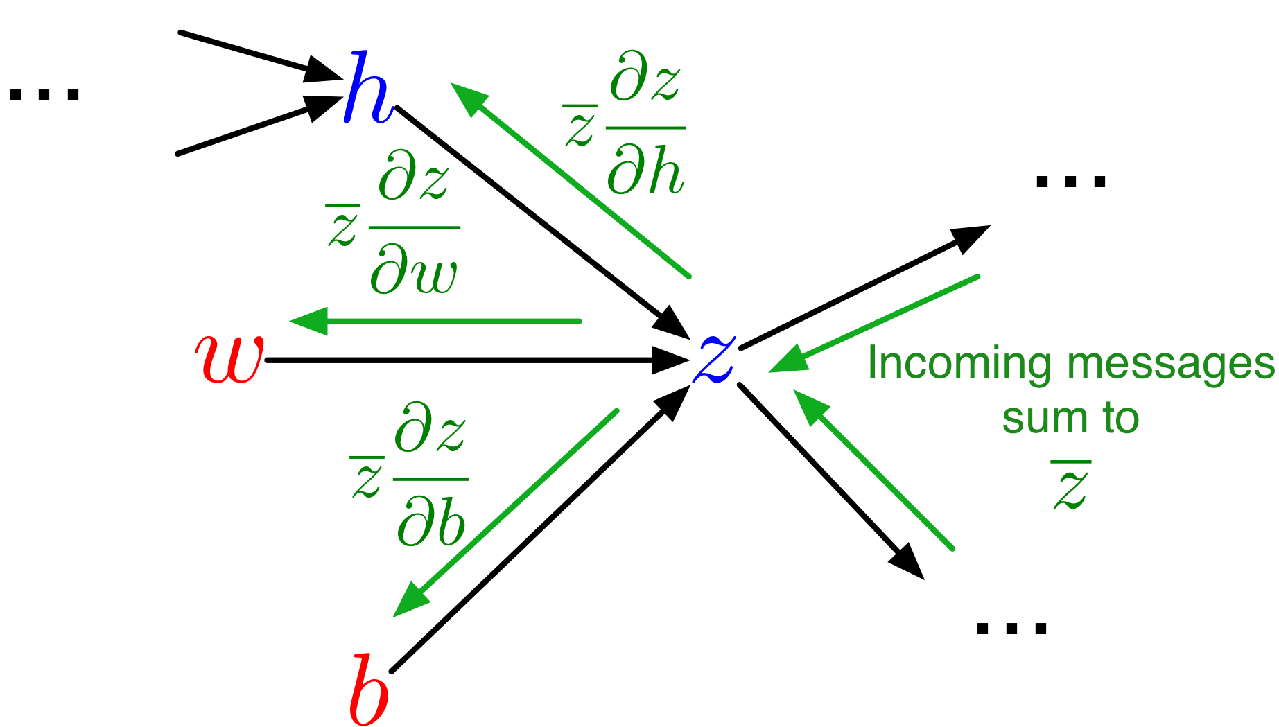 lambda g, ans, x, y : unbroadcast(y, -g))This design provides modularity! Each node needs to know how to compute its outgoing messages, i.e. the VJPs corresponding to each of its parents (arguments to the function).
