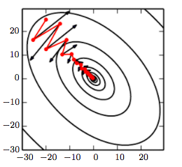 \[\begin{align*} {\bf p} &\gets \mu {\bf p} - \alpha \frac{\partial \mathcal{E}}{\partial \theta} \\ \theta &\gets \theta + {\bf p} \end{align*}\]