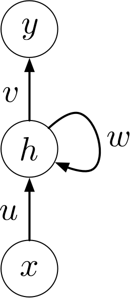 Backpropagation updates: \[\begin{align*} \overline{h^{(t)}} &= \overline{z^{(t+1)}} \, w \\ \overline{z^{(t)}} &= \overline{h^{(t)}} \, \phi^\prime(z^{(t)}) \end{align*}\]