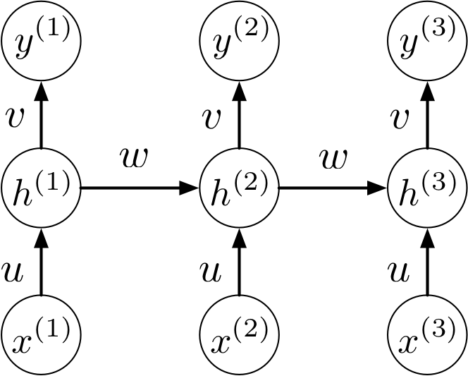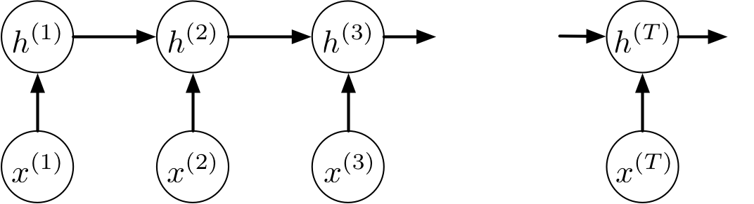 \[\begin{align*} {\bf h}^{(4)} &= f({\bf h}^{(3)}, {\bf x}^{(4)}) \\ &= f(f({\bf h}^{(2)}, {\bf x}^{(3)}), {\bf x}^{(4)}) \\ &= f(f(f({\bf h}^{(1)}, {\bf x}^{(2)}), {\bf x}^{(3)}), {\bf x}^{(4)}) \end{align*}\]