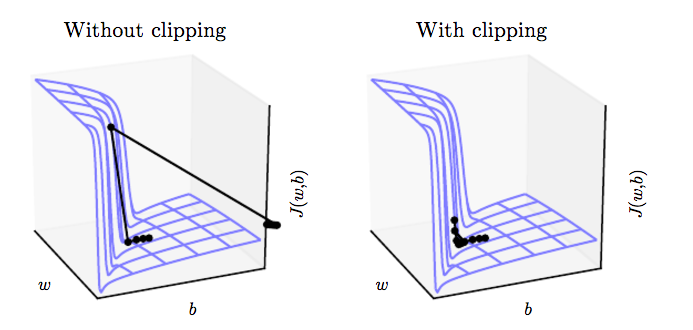 One solution is to “clip” the gradient so that it has a norm of at most \(\eta\). Otherwise, update the gradient \({\bf g}\) with \({\bf g} \leftarrow \eta\frac{{\bf g}}{||{\bf g}||}\)