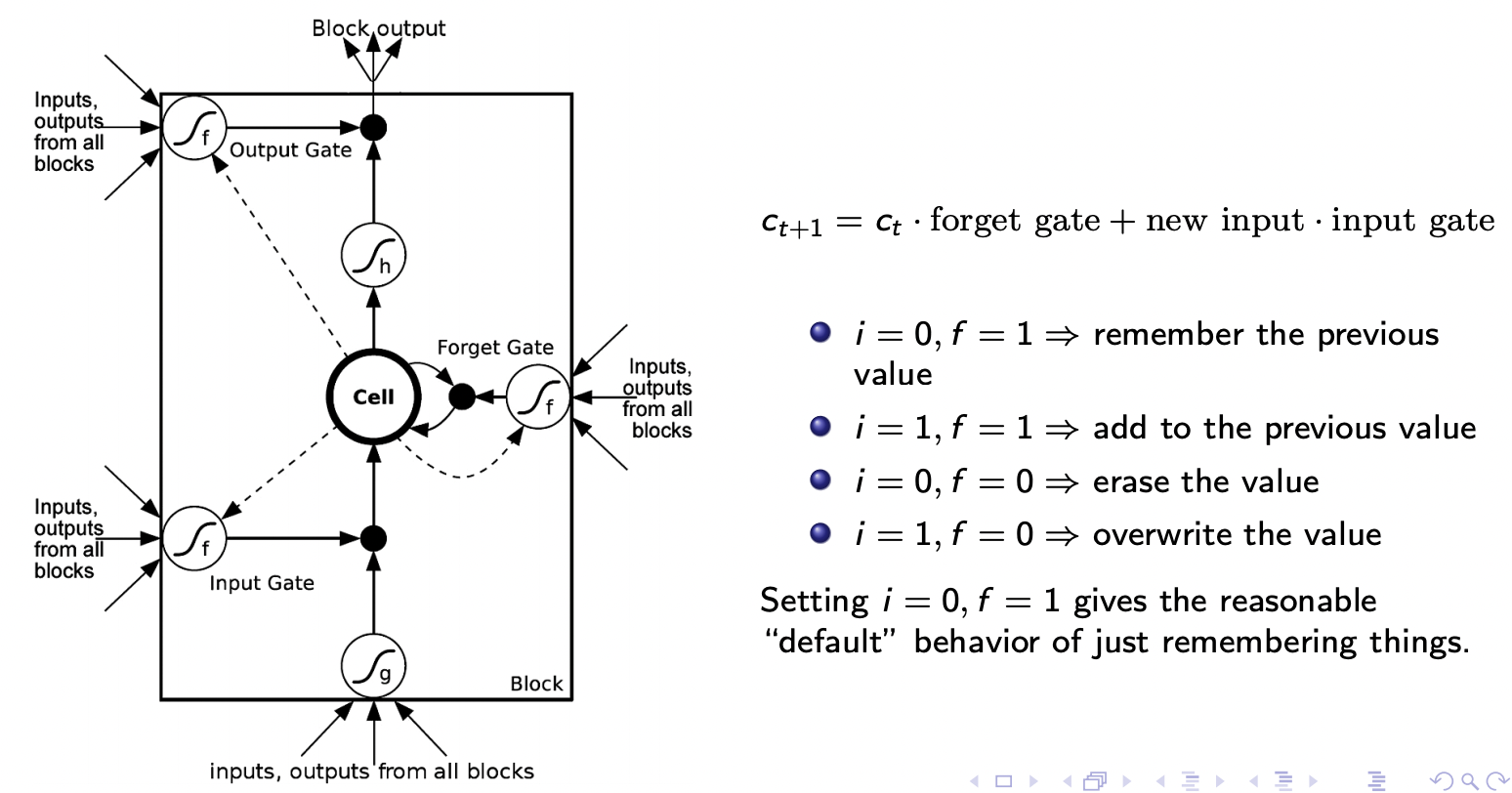 Exercise: show that if \({\bf f}_{t+1} = 1\), \({\bf i}_{t+1} = 0\), and \({\bf o}_{t} = 0\), then the gradient of the memory cell gets passed through unmodified, i.e., \(\bar{{\bf c}_t} = \bar{{\bf c}_{t+1}}\).