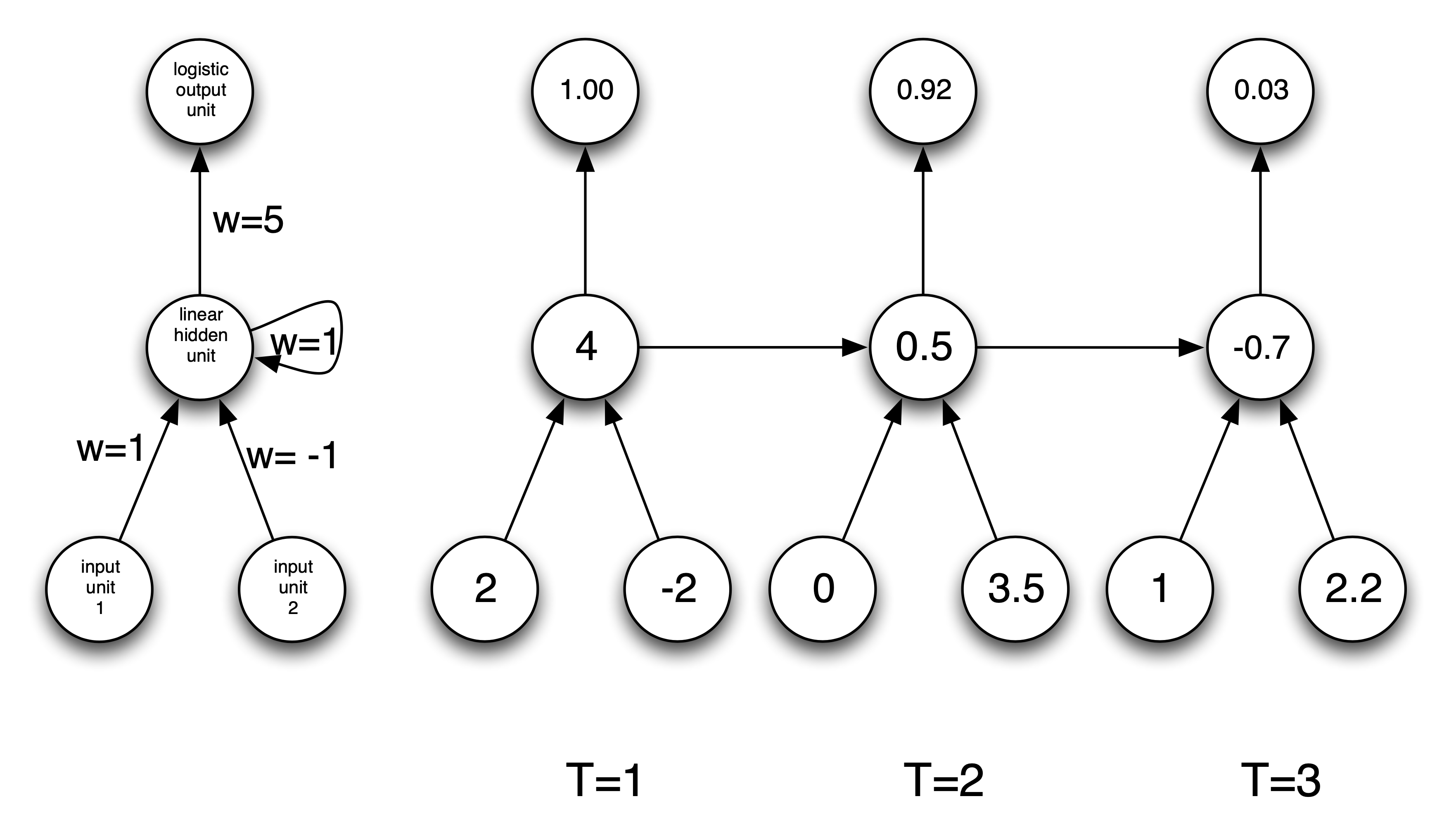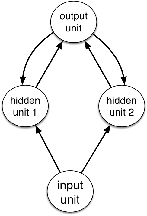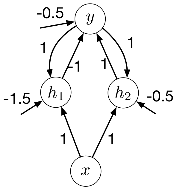 Let’s find weights and biases for the RNN on the right so that it computes the parity. All hidden and output units are binary threshold units (\(h(x) = 1\) if \(x > 0\) and \(h(x) = 0\) otherise).