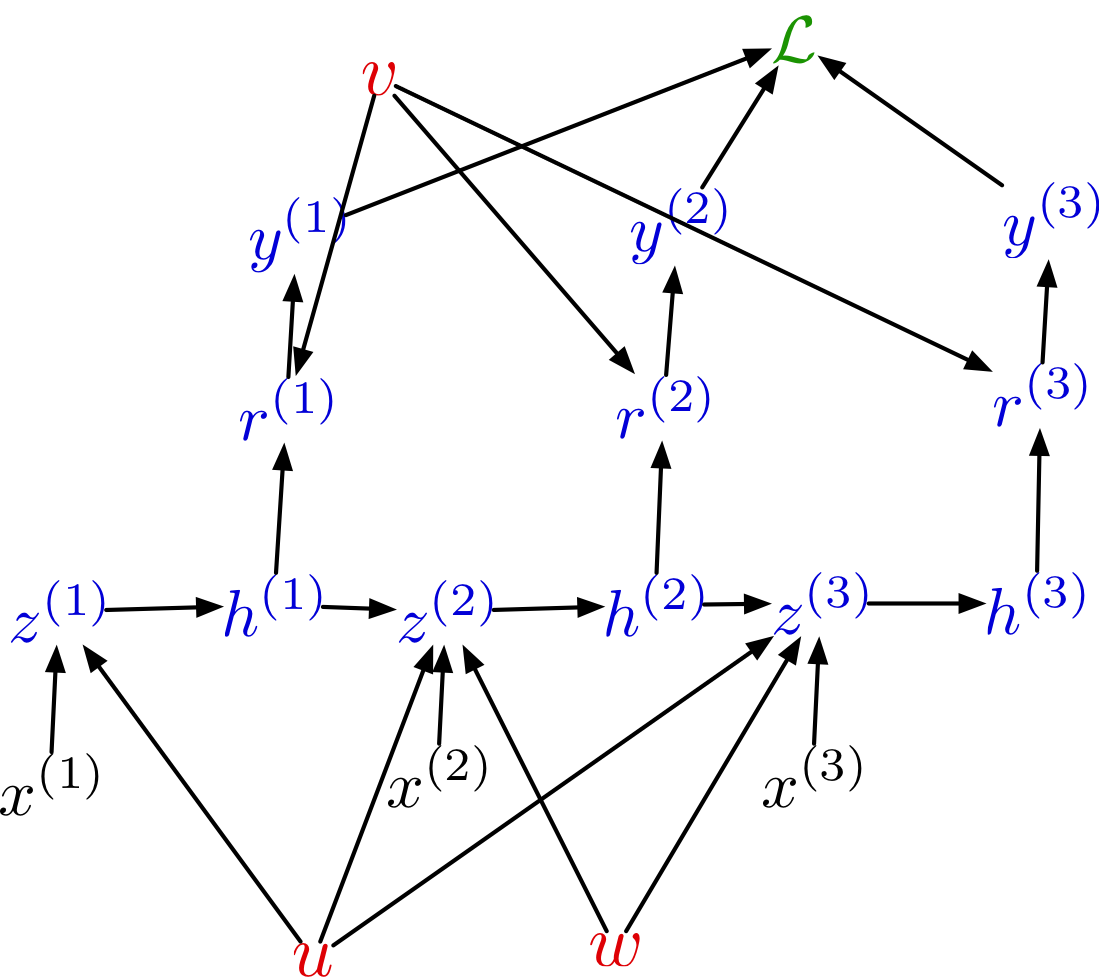 Activations: \[\begin{align*} \overline{\mathcal{L}} &= 1 \\ \overline{y^{(t)}} &= \overline{\mathcal{L}} \, \frac{\partial \mathcal{L}}{\partial y^{(t)}} \\ \overline{r^{(t)}} &= \overline{y^{(t)}} \, \phi^\prime(r^{(t)}) \\ {\color{magenta} \overline{h^{(t)}}} & {\color{magenta}\, = \overline{r^{(t)}} \, v + \overline{z^{(t+1)}} \, w} \\ \overline{z^{(t)}} &= \overline{h^{(t)}} \, \phi^\prime(z^{(t)}) \end{align*}\]