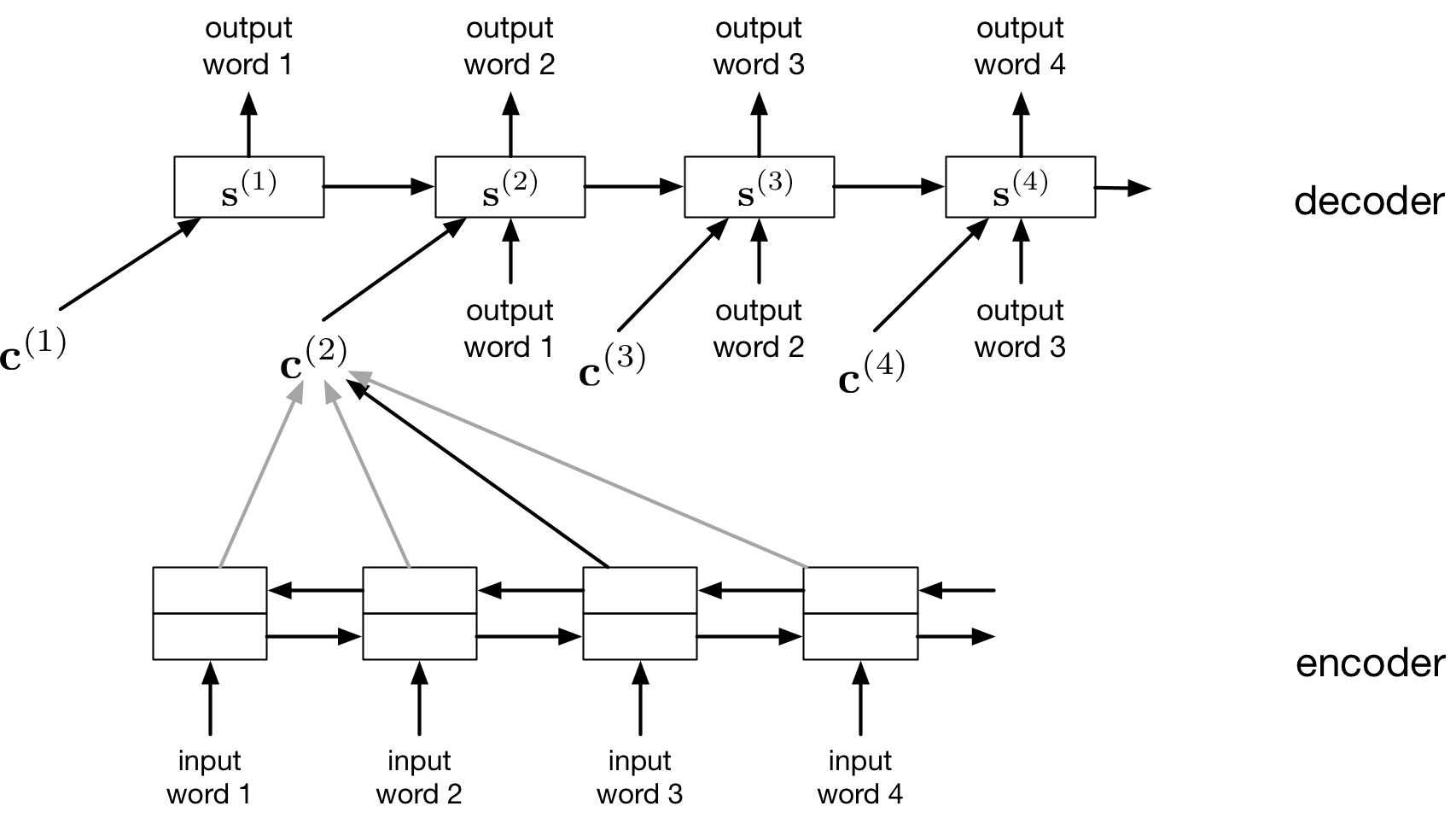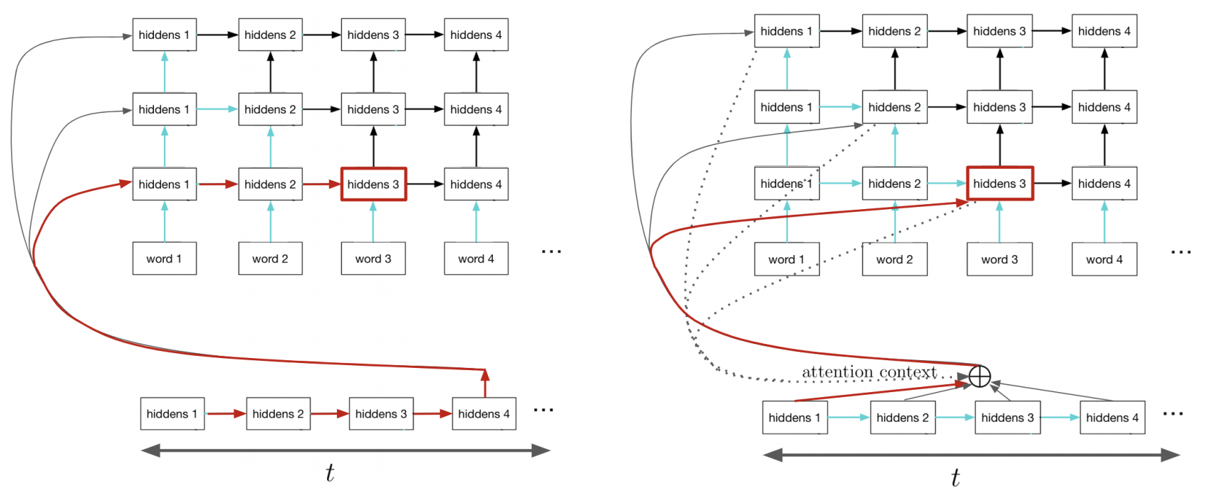 Attention-based RNNs have a constant path length between the encoder inputs and the decoder hidden states. (Learning becomes easier. Why?)