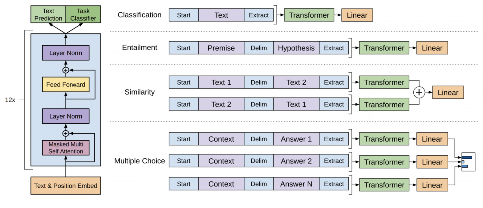 The pre-trained model is then fine-tuned on textual entailment, question answering, semantic similarity assessment, and document classification