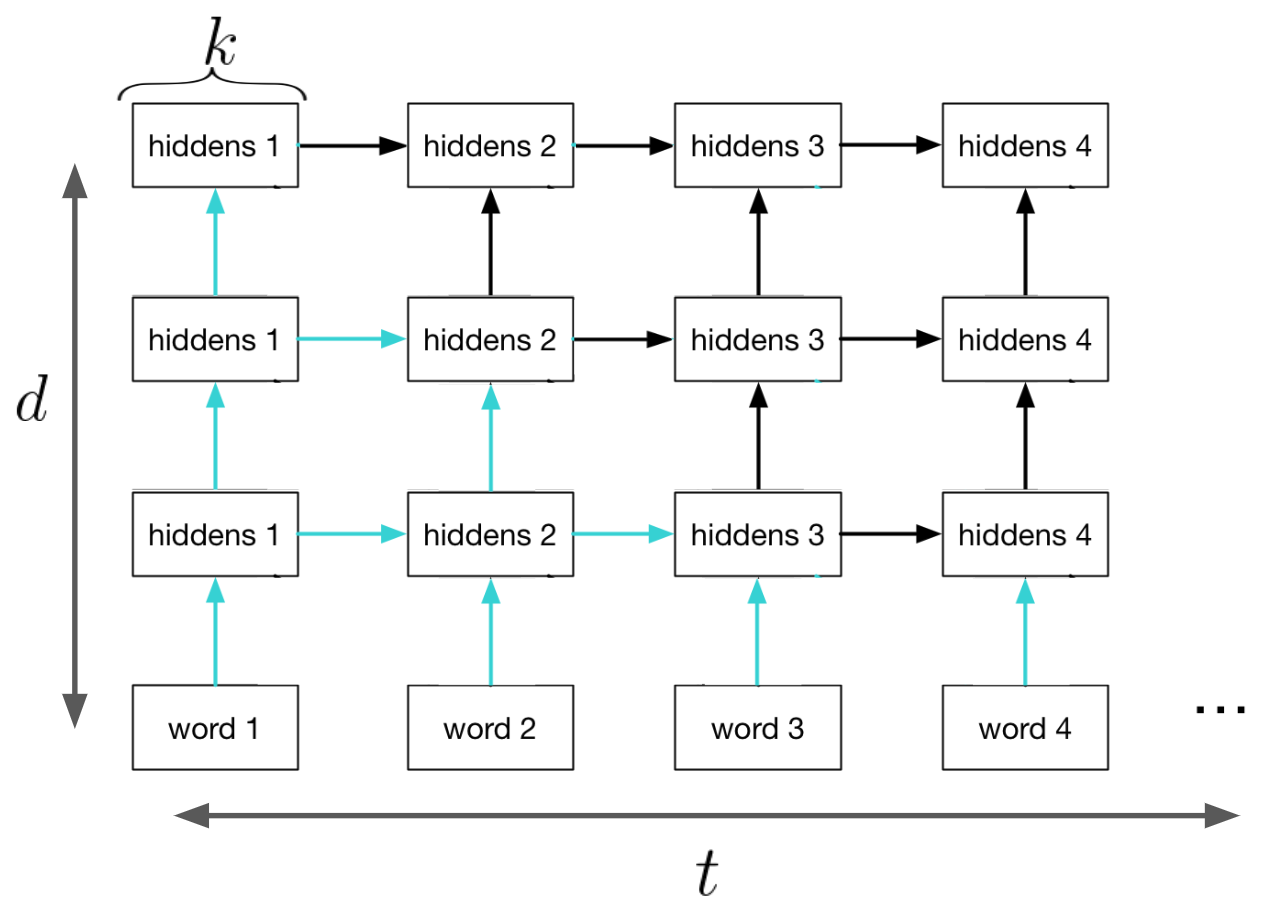 One disadvantage of RNNS (and especially multi-layer RNNs) is that they require a long time to train, and are more difficult to parallelize. (Need the previous hidden state \(h^{(t)}\) to be able to compute \(h^{(t+1)}\))