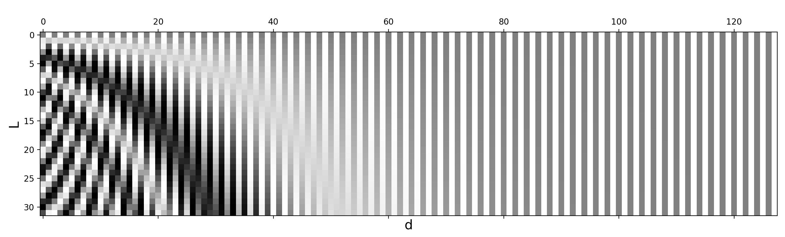 \[\begin{align*} PE_{\text{pos}, 2i} &= \sin\left(\text{pos}/10000^{2i/d_{emb}}\right) \\ PE_{\text{pos}, 2i+1} &= \cos\left(\text{pos}/10000^{2i/d_{emb}}\right) \end{align*}\]
